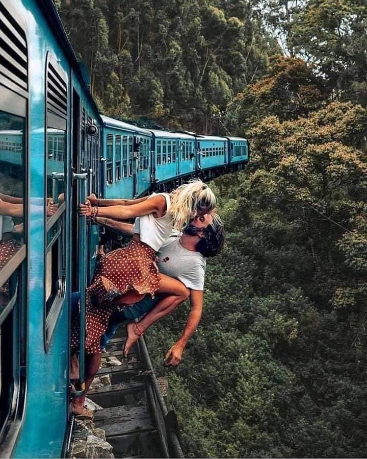 A bright turquoise-blue passenger train with multiple connected coaches, sliding windows, open doorways with metal handrails, and a small footboard—typical of Sri Lanka’s scenic hill-country railway.